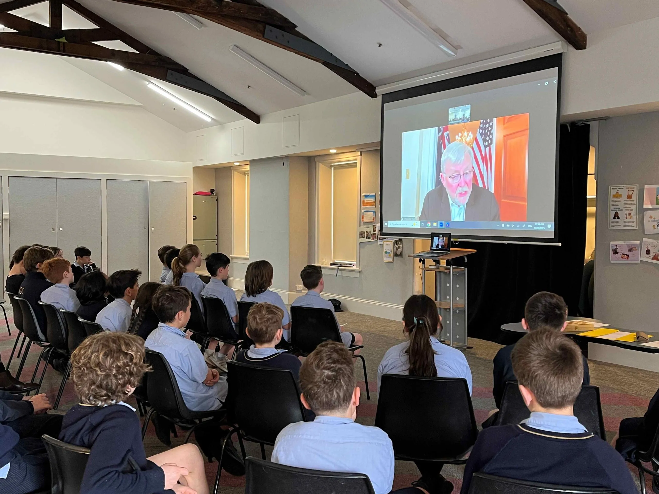 Year Five students had the opportunity to meet online with Ambassador Kevin Rudd on 10 September as part of their Global Citizenship and Early Colonies Unit of Work. Ambassador Rudd responded thoughtfully to questions posed by a student panel—from Joseph Welch’s visionary inquiry, “Could you describe your vision of an ideal world?” to Mila Cooper’s question about The Ambassador’s legacy, “Can you tell us about one important change you made to create peace, sustainability or equality for Australians?”
