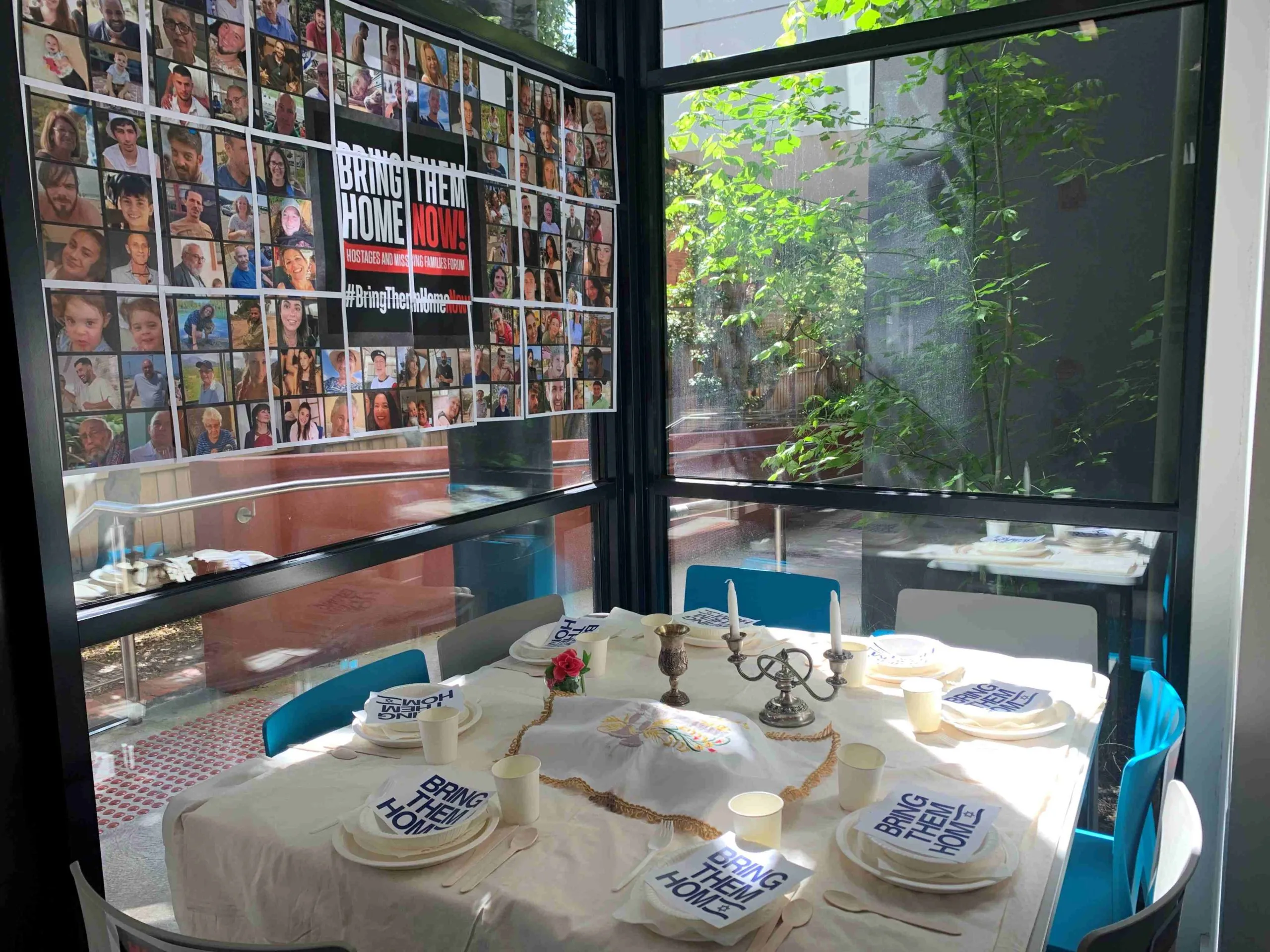 This Shabbat table has been constructed as a reminder of the more than 200 hostages currently being held in Gaza by Hamas. We leave the seats empty as a symbol of the hostages who are unable to attend Shabbat with their loved ones. This installation originated from the Tel Aviv Museum of Art where they set a table of over 200 seats for the hostages and is now being used as a way of holding the hostages in mind, all around the world. This Shabbat table is constructed as a plea for these people brought back home to their families and to their country. Our students and staff are praying for the hostages' safe return.