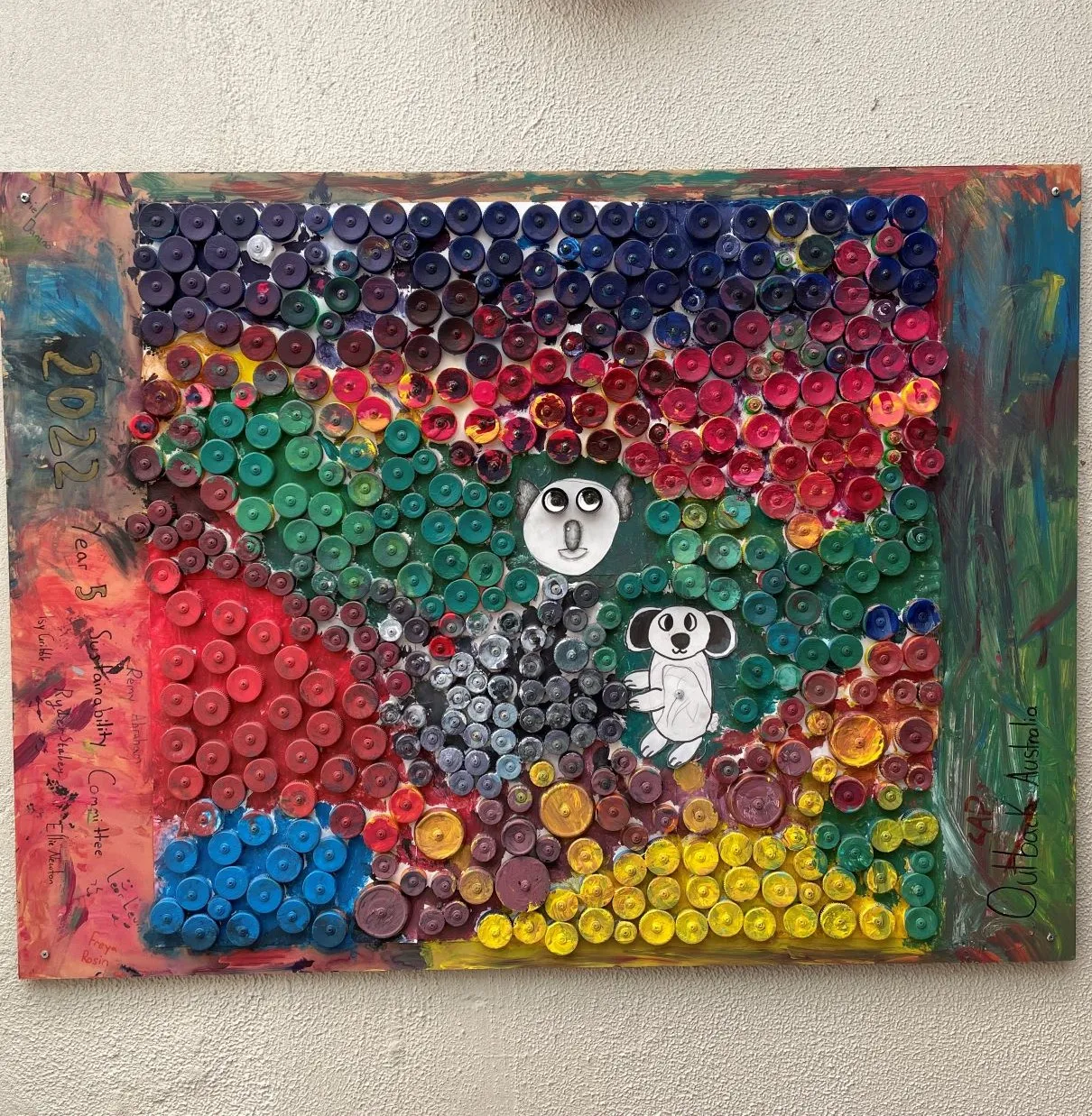 The Va'ad collected the bottle caps, designed the mural and helped drill, stick and paint them onto the wall. The mural, titled 'Outcap Sunset' is of an Australian outback sunset and has two koalas sitting on a tree branch.