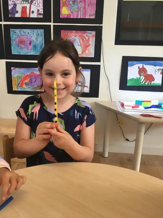 We practised drawing and crossing the mid-line through drawing and painting a Chanukiah for a classroom wall display. Crossing the body’s mid-line is the ability to reach across the middle of the body with the arms and legs. This allows children to cross over their body to perform a task on the opposite side of their body (e.g. being able to draw a horizontal line across a page without having to switch hands in the middle, sitting cross-legged on the floor). We often practice crossing the mid-line during sport or through dancing with scarves and holding them in the right hand and touching our left knee, or holding them in our left hands and touching our right shoulders etc. Crossing the body’s mid-line is an important developmental skill needed for many everyday tasks such as writing, reaching towards your foot to put on a shoe and sock with both hands and hitting a ball with a bat. We drew our Chanukiah then used masking tape to cover the lines, covered our page in metallic paint and one dry peeled off the tape to reveal a beautiful outline