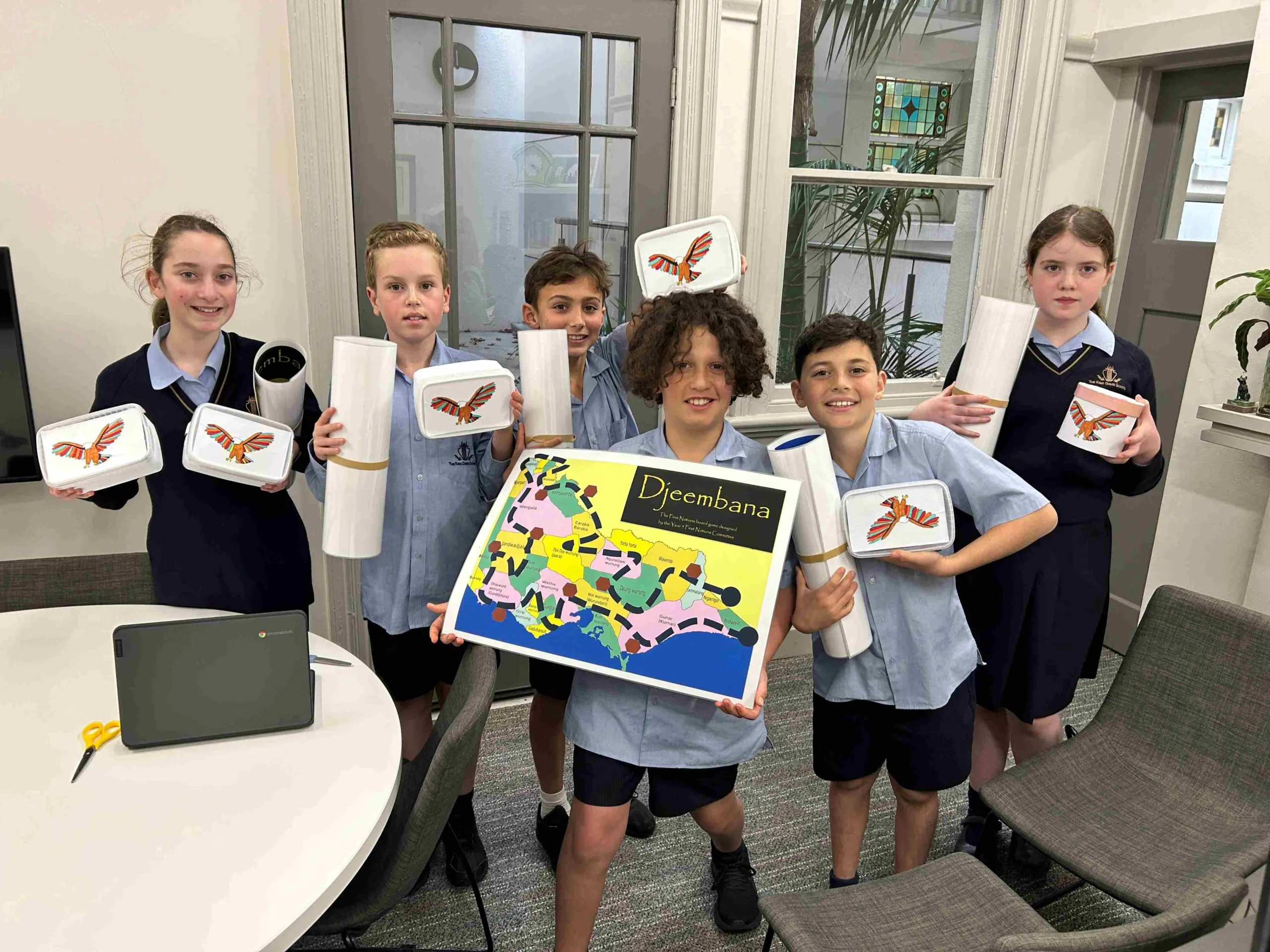 The Year 5 First Nations Va'ad (committee) have developed a board game entitled Djeembana (gathering) which helps children learn about First Nation's culture. They wanted a creative and engaging way of teaching about First Nations culture and decided upon a board game. They then set about designing the board, pieces and a unique way of advancing from space to space using feathers.